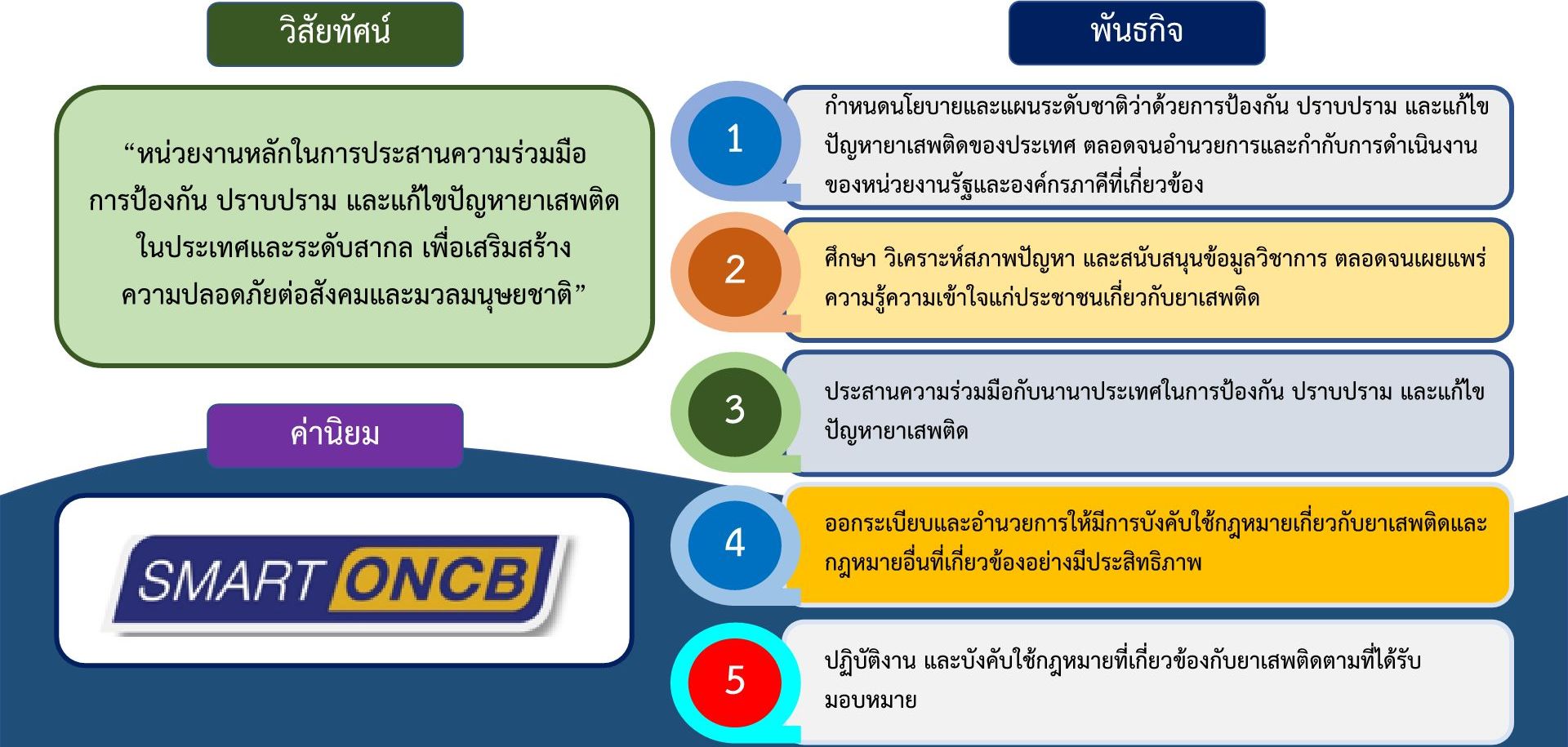 “หน่วยงานหลักในการประสานความร่วมมือการป้องกัน ปราบปราม และแก้ไขปัญหายาเสพติดในประเทศและระดับสากล เพื่อเสริมสร้างความปลอดภัยต่อสังคมและมวลมนุษยชาติ”