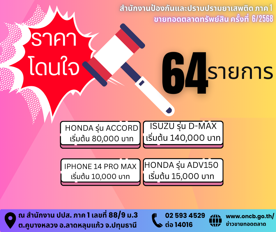สำนักงาน ปปส. ภาค 1 กำหนดขายทอดตลาดทรัพย์สินที่ไม่เหมาะสมจะเก็บรักษาไว้ ครั้งที่ 6/2568 จำนวน 64 รายการ