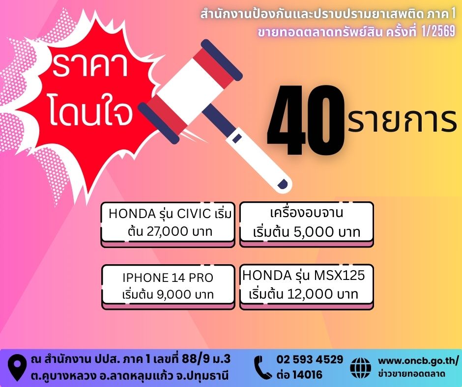 สำนักงาน ปปส. ภาค 1 กำหนดขายทอดตลาดทรัพย์สินที่ไม่เหมาะสมจะเก็บรักษาไว้ ครั้งที่ 1/2569 จำนวน 40 รายการ